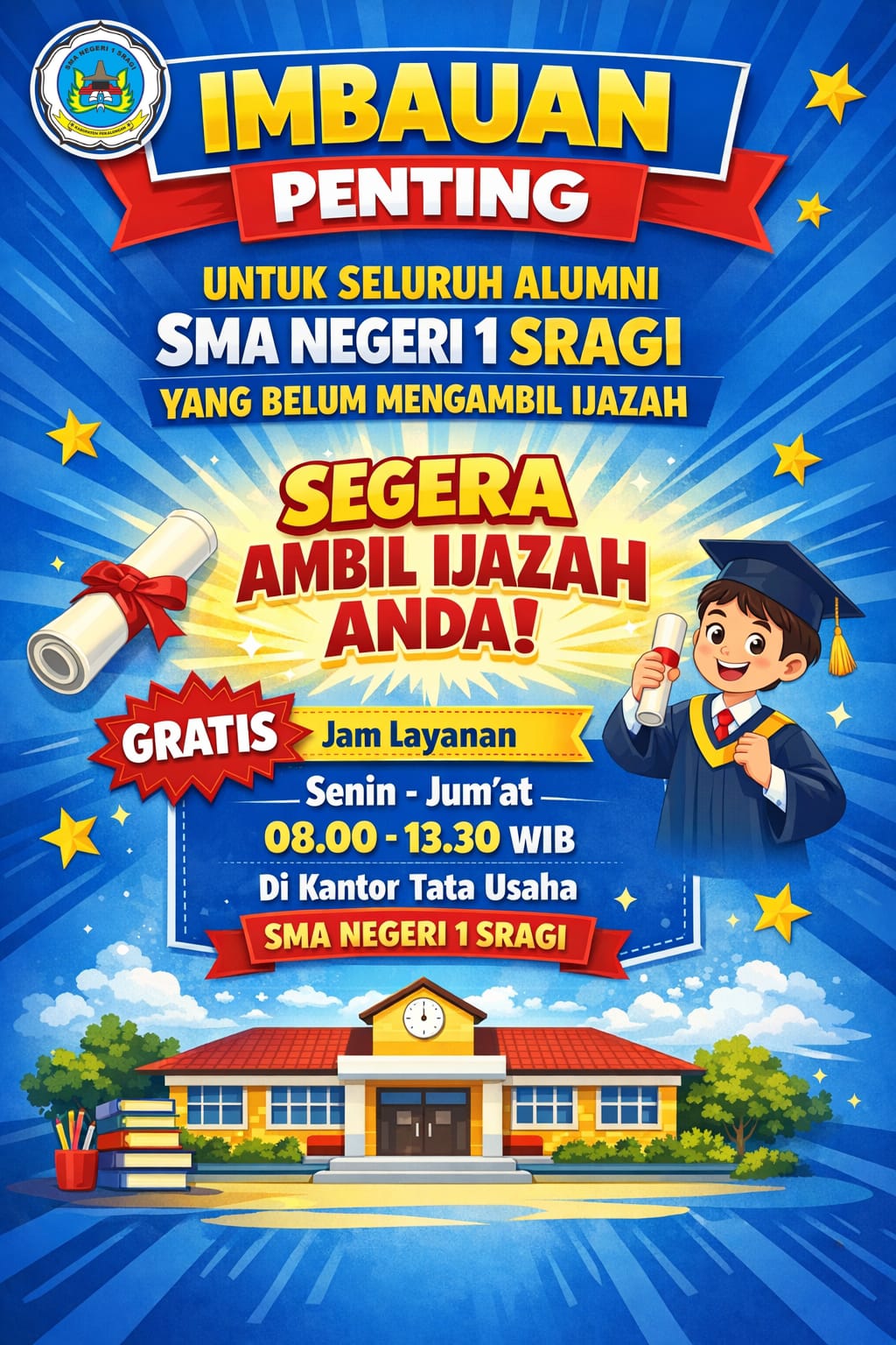 Disampaikan kepada para Alumni SMAN 1 Sragi, yang belum ambil Ijazah untuk segera diambil... GRATIS!!!